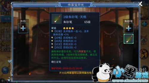 传家宝外观都是65级,任何等级的朱砂笔都可以开光,开光之后,朱砂笔的等级取代外观的等级。