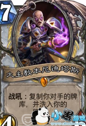 大主教本尼迪塔斯属于牧师职业的新橙卡,有着4-6的不错身材,其卡牌效果战吼,能将对方的剩余牌库全部复制,置入我们的牌库,注意这里是全部而不是一张哦!