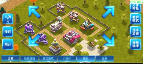 当然为了更加便于萌主的操作,点开左上角的“开”就会有跳出4个方向的箭头,通过选定建筑物,即可根据箭头方向进行相应的移动,可以选择相同建筑物、整列建筑物进行箭头方向的缓慢移动。更适用于装扮细节上的调整哦~