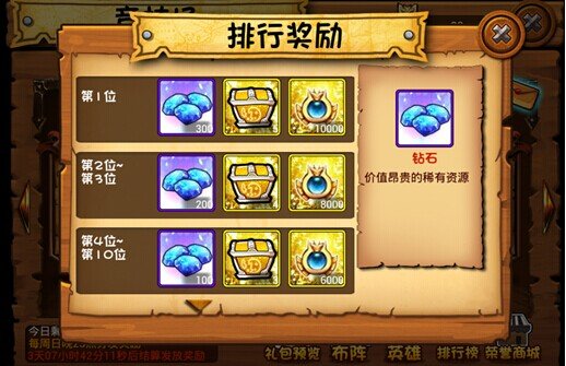 竞技场能够让和实力接近的玩家进行排位战,在战胜对手后会获得相对的荣誉值和更高的排名,每周会进行奖励统计,获得大量的荣誉、高级神器碎片和钻石奖励,排名越靠前的玩家,获得的礼包越丰富。