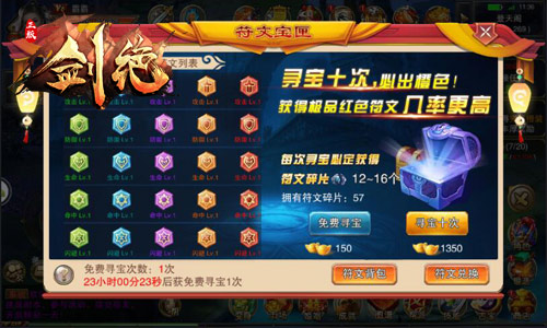 有零元党玩家曾吐槽:什么玩法都要花钱,实在太奢侈!小编告诉各位,在冰河游戏《剑绝》中,符文无需买,人人皆可抽!游戏中,玩家每天均可免费获得一次符文宝匣寻宝资格,随机GET各品质顶级符文与海量符文碎片,如果玩家愿意当一次土豪,进行十连寻宝,更可100%获得任意属性橙色符文一颗哦!