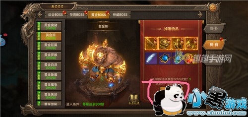 黄金boss是稀有boss,最低等级是1500级,最高等级3400级,即使是最多等级的黄金boss也需要玩家(0元党)等级在300级之上才可以打过。1900级以上的黄金boss就会掉落绝学与秘籍了。