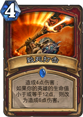 | 造成4点伤害;如果你的英雄的生命值小于或等于12点,则改为造成6点伤害。 | |