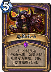 | 对一个随从造成5点伤害,如果该随从是友方恶魔,则改为使其获得+5/+5。 | |