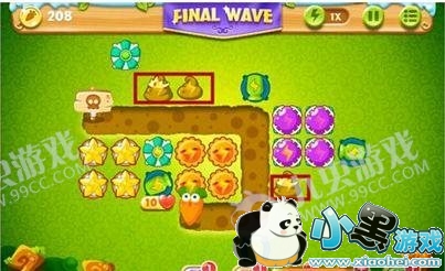 5、玩家剩下要做的事情就是操作炮塔清除场上的道具,有了金币就提升炮塔的等级,建议先把太阳花和魔法球等级攀升,另外玩家可以适当建造一些便便塔来加强减速控制!
