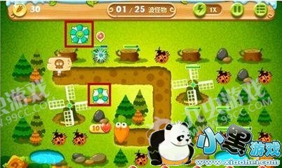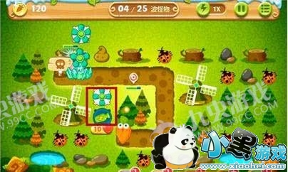 3、点掉右边的松树后,我们能得到1组4个太阳花的火力支援,有了这组太阳化后,我们选择把其中的2个太阳花先提升到顶级,这时小怪就基本没压力了!