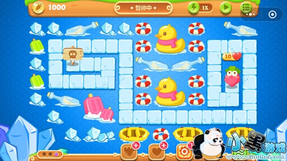 2、清除双子漂流瓶,小怪交给第一个漂流瓶爆破出来的瓶子炮塔,但不要升级,在完成限时任务之前,所有的金币优先升级用来清除障碍物的武器。然后打上面的鸭子,出来四个便便卖掉。