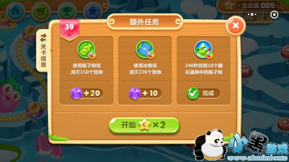 开局:不花钻石,领取免费随机道具。倒计时后暂停,右上角缺口放置满级冰锥塔,选右边的漂流瓶为目标,小怪来不用管。