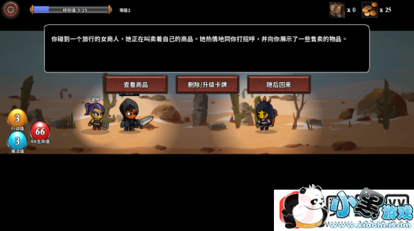 商人可以购买卡牌装备、回血、升级卡、删除卡,商品可以刷新但是刷新需要的金币会递增;回血比例为25:25;升级/删除卡一般只推荐进行一次。