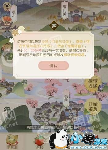 1、在【江湖】中选择【开始游历】,游历过程中每10~20分钟会有一次收获,有几率可获得奇景。
