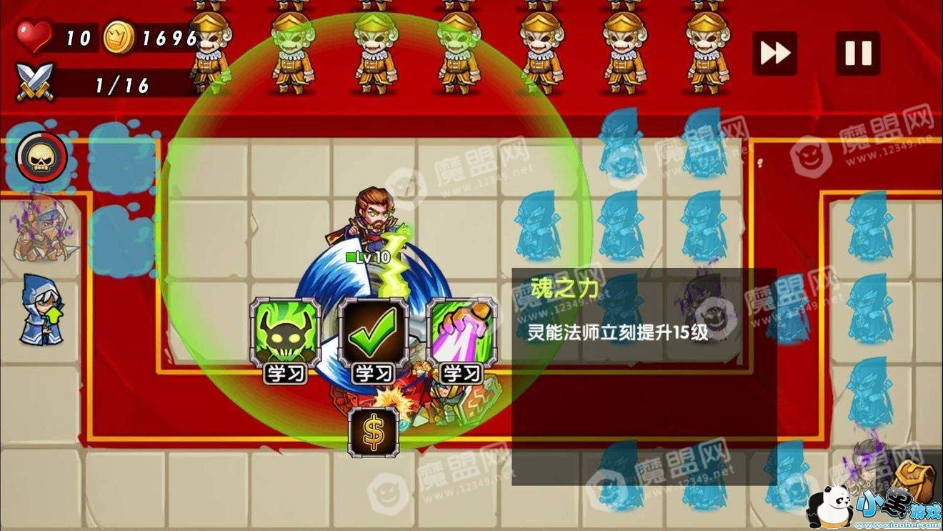 冰法差20块升级,优先升2级。但是不要选任何敌人。不选他会自己找没被减速的,你选了就打一个了。