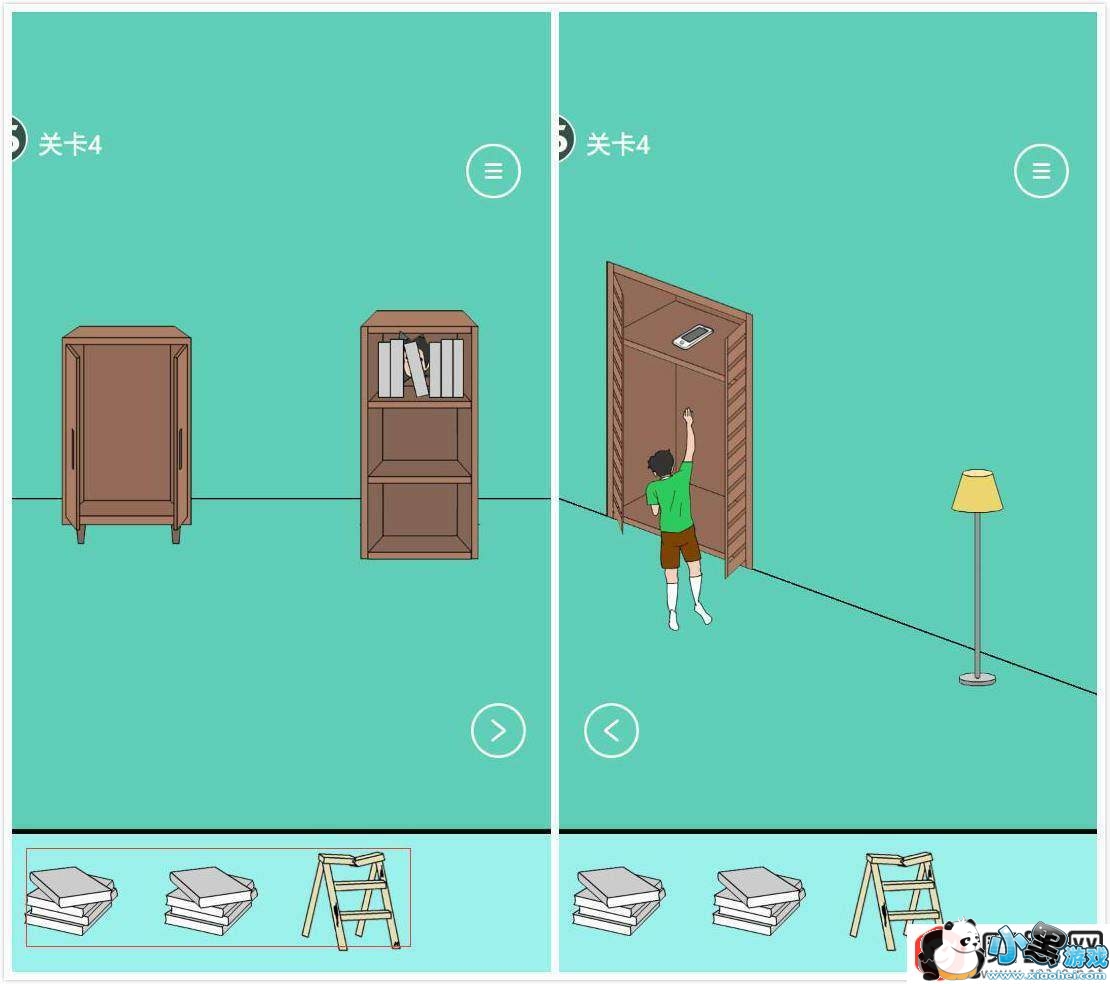 4、关卡4:将书架上的书收集起来,手机在衣橱里。书垫到脚下即可。