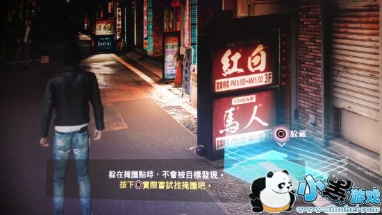 开始跟踪,躲在这种有蓝色躲藏点的地方就不会被抓到了,走到他去自动贩卖机前买饮料会回头走一段,要躲回去一点,他抽烟的时候就会继续推进,继续跟踪他到冠军街