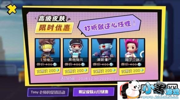走过路过不要错过,一年一次的优惠大甩卖,奇葩委员会倾情赞助!活动期间黑色旋风、1号电工、喵了个咪、清朝皮肤四款指定高级皮肤五折售卖,买不了吃亏买不了上当!