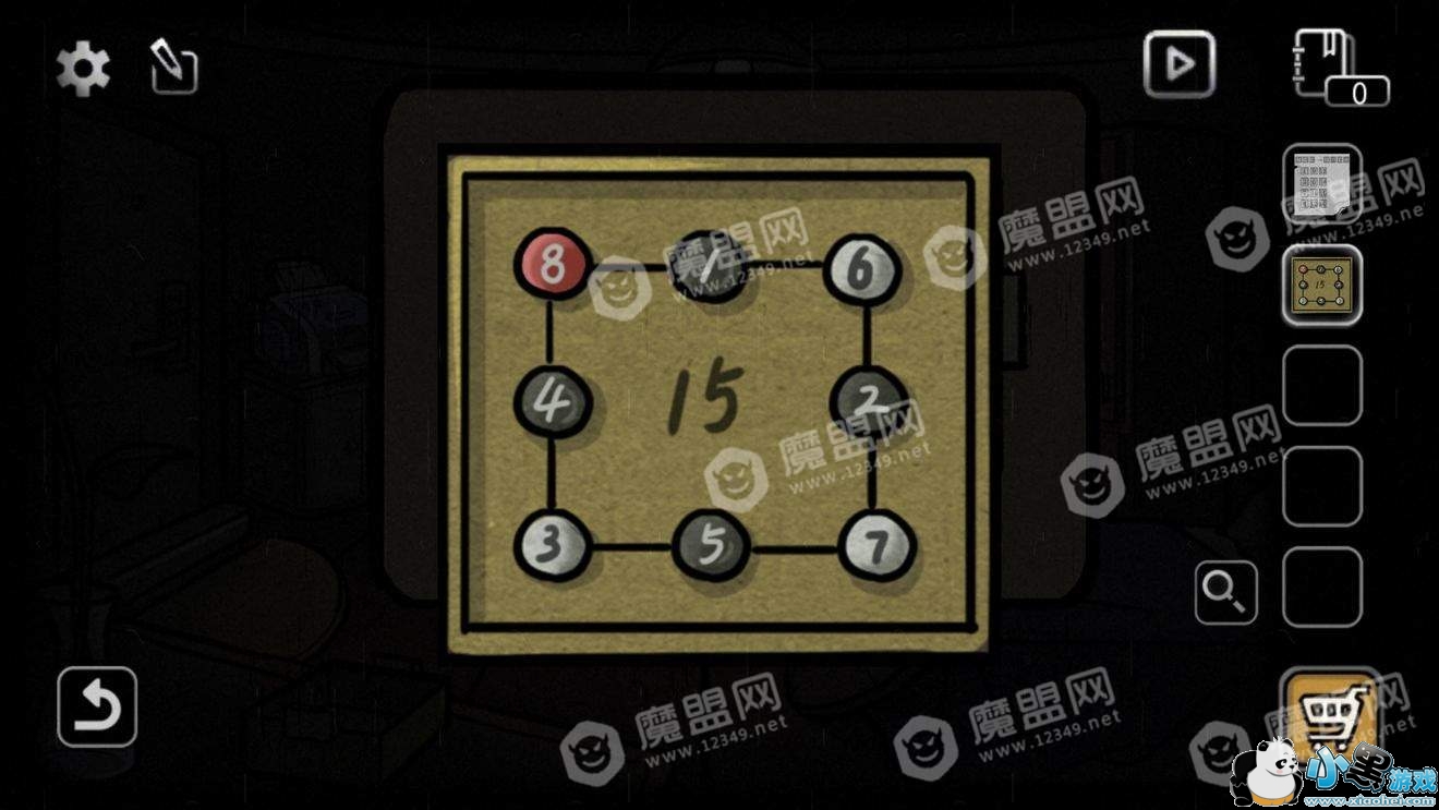 点击左下角的盒子,使每条线的数字相加等于15,(白色圆圈里的数字不可更改)。