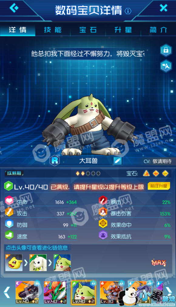 3、总结:大耳兽获得方式比较简单 普通抽奖及孵化都可以获得,大耳兽主要是看宝石槽,菱形的最为重要,只有菱形宝石孔能加速度,三菱大耳最好,不建议新手升级,只要能优先我方能先行动就行
