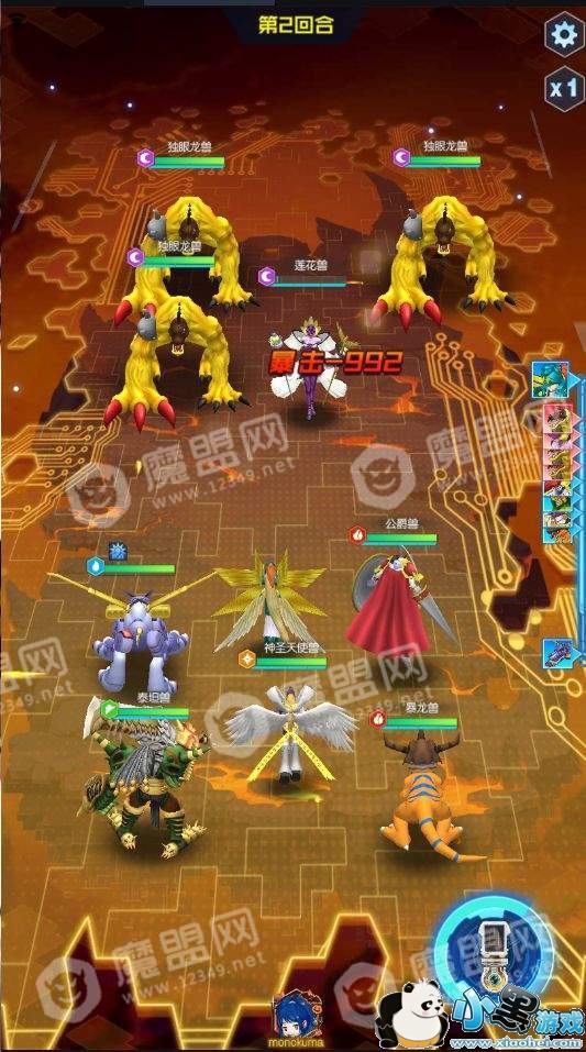 守关数码兽莲花兽,拥有复活队友的技能,如果不能及时消灭,玩家很容易被莲花兽不断地复活、消耗到减员。同时,三只独眼龙兽的攻击非常高,玩家最好有一只治疗型的数码兽,防止被一轮集火带走。