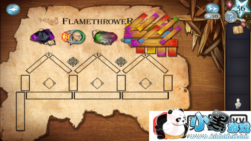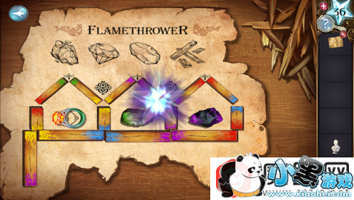 移动木板,将其按颜色放上去。然后把碳堆,钻戒,燧石放到相应的位置,完成后如下图。完成后获得喷火器。