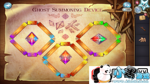 回到走廊,进入中间的房间,这时候桌面出现了一幅新的图。点击把水晶放上去。完成后的拼图如下。完成后获得3个紫盒子。再次点击查看图。