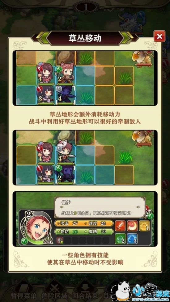 敌我双方移动到草丛地形时候都会消耗额外的移动力,因此经常出现一回合中走进草丛要等下回合才能走出来的情况。
