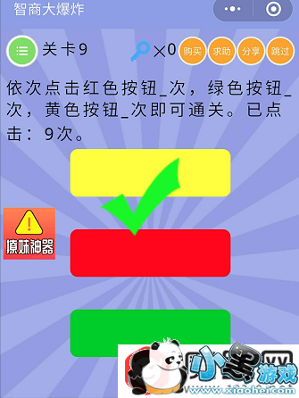 第九关,依次点击红色按钮5次,绿色按钮3次,黄色按钮1次即可通关。