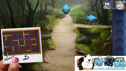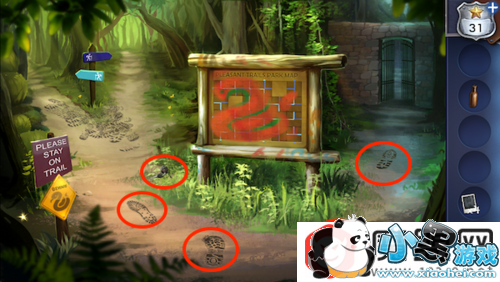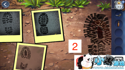 点击左边岔路的指示牌下面的脚印。把8张脚印的照片放上去,挑出3张和地上的脚印一样的照片。这里有3轮脚印要挑。