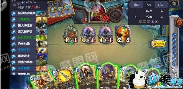 对面后手跳海德尼尔冰霜骑士,这里可以选择下下水道爬行者或者正义保护者加力量祝福,下水道爬行者费合理,但正义保护者加力量祝福场面更好,猎人不好处理4-1嘲讽圣盾,极大可能白吃对面两个随从。