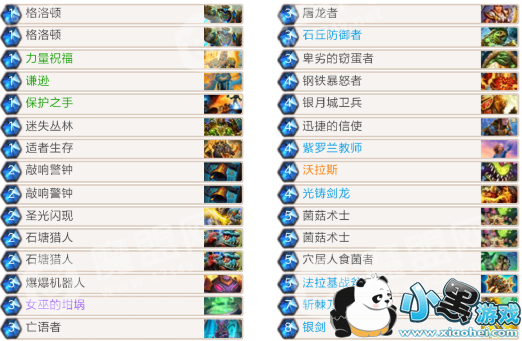 以上这几套牌每套都有6到7张1费,优质的1费随从(格洛顿、火羽精灵、迷失丛林、正义保护者、银色侍从、萨隆铁匠监工等)和武器(圣光的正义)可以让你在前期建立场面优势,在有场面的基础上配合一些buff(力量祝福、适者生存、敲响警钟、保护之手、谦逊等)可以以小换大或者白吃对面的随从。