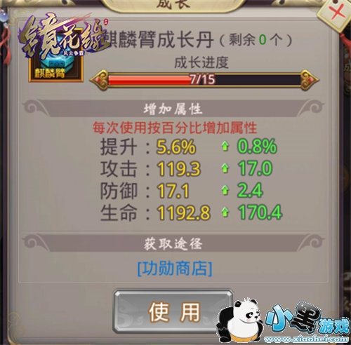 在麒麟臂升级到四阶后,可以开启麒麟臂成长系统。麒麟臂阶数越高,成长等级上限越大。使用麒麟臂成长丹可以升级成长等级,成长等级升级后会增加百分比属性,同时增加人物属性。