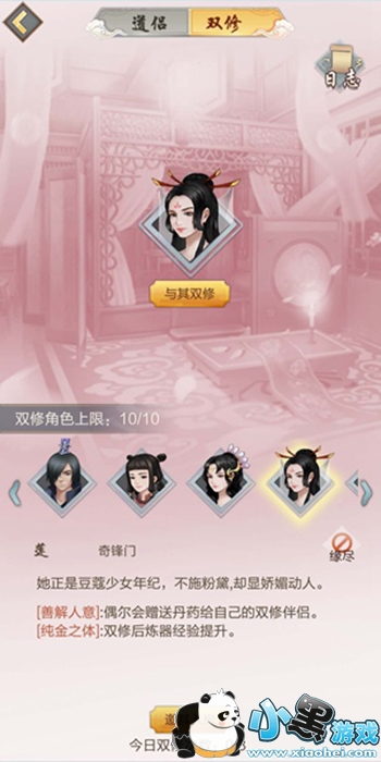 和自己心仪的道侣双修可以获得一定的奖励,每一位道侣都不相同,需要大家去发现。