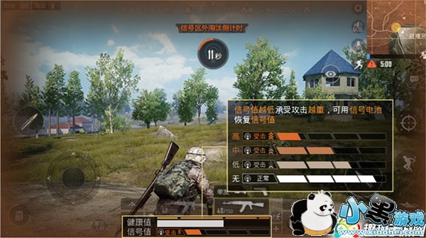 在和平精英这款游戏中,原本刺激战场的毒圈设定被更改成了信号接收区域,如果玩家在信号区外面的话,那么血条下方的信号值就会逐步减少,而在屏幕中央也可以看到我们玩家还剩多少时间可以逗留在信号区外,这里要注意的是,信号值到0时就会被直接淘汰,和血条是一样重要的。