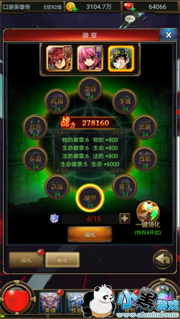如何分配强化等级、徽章等级也是有讲究的,小黑游戏小编建议前期多分配无色和白金徽章给近战英雄,同时多进行野外冒险获得更多装备进行熔炼,得到更多无色小晶块。