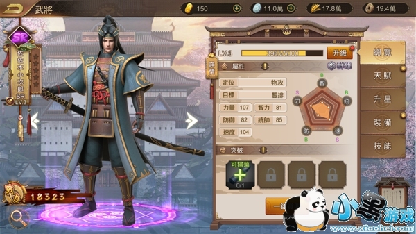 点击武将卡牌,可具体查看该武将详情。在总览页面,我们能看到武将目前的战力、属性等,比如佐佐木小次郎的定位是物攻,目标是竖排,其力量、智力、防御、统帅和速度也都一一列出来。点击详情,还可以看到武将的属性详情和其生平。