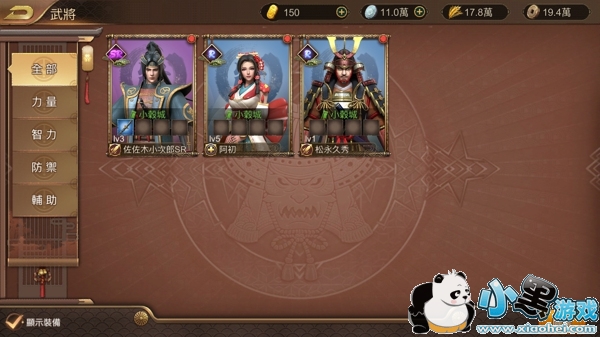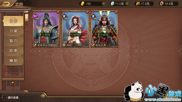 在主界面右下方菜单中点击“武将”,进入武将列表页面,该页面以武将等级、稀有度为依据,将武将依次排列,在列表的左侧,将已经拥有的武将按照力量、智力、防御和辅助分类。