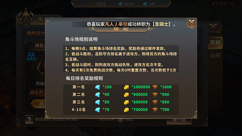 每晚9点,结算角斗场排名奖励,奖励将通过邮件发放。