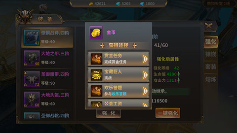 装备强化是需要消耗较多金币,当金币消耗完了,你可以通过赏金任务、宝藏巨人、欢乐答题、工会工资等途径获取。