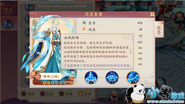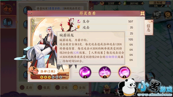 和前面两个不同,洛神是一名强大的群体输出。AOE技能加成在理想环境下可以打出430%的加成,并且大概率附加沉默降低攻击的效果。在斗妖场中洛神一直都是热门符灵。