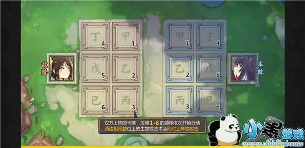 游戏中双方都拥有都拥有2*3总计6个行动格。这六个行动格按照甲乙丙丁戊己的顺序排列,也就是说我们如果想要在本回合中给一名可以行动的右方单位增加属性的好,尽量要将法术卡放在人物卡之前。
