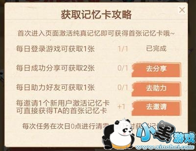 2.每日完成登录游戏、分享、助力任务,共可获得4次获取机会,获得4张不同的记忆卡;