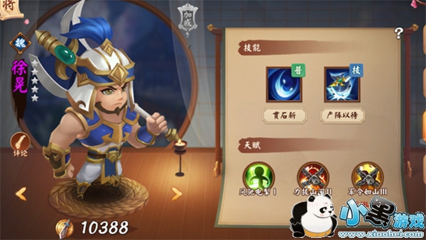 叠最厚的甲,挨最毒的打。徐晃如同他的名号一般,在颤抖吧三国世界中扮演着“无敌将军”的角色。就拿他的技能严阵以待来说,对单体目标有50%的几率沉默两回合,并且在两回合之内为前排队友增加一个护盾(护盾值受徐晃体质影响)。从这我们不难看出,徐晃是一个单体控制加上群体辅助的功能性肉盾,再加上前期获取难度并不大(铜雀台达到5级加上制造出一枚铁斧)。想搭建“猛汉”组合的玩家们,千万不要错过了,绝对能肉到对面绝望,不过输出过低,还是推荐1个术士+一个谋士放后排,来加快自身的战斗效率。