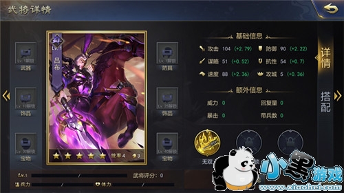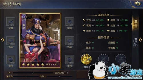 先看下属性,这个属性在五星武将能算是上等水平,初始属性都比较高而且都有加成,但总体和他的义父董卓属性相差不大。但是攻击达到了104的高数值,而且他的攻击加成达到了2.79,再看下吕布其他初始数值,防御达到了90,谋略和抗性分别是51和54,数值加成攻击、防御和速度都突破了2,但是谋略和抗性的数值都低于董卓。吕布的初始数值及其加成甚是优秀,但他最大的弱点就是攻城,数值只有5,并且加成也只有0.36,在五星将领中几乎是最低的。