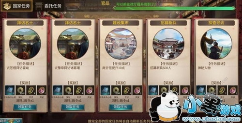 国家任务可以使用委托功能,可以消耗一个委托令来挂机完成一个任务,需要消耗一定时间,当然如果你有钱,可以直接点击领取。