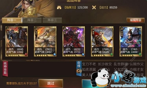 当我们点击开战后会进入阵容编辑的这个界面,在这个界面是有跳过功能的,并且要求了战力,如果右上角的战力达到标准即可跳过,所以如果是土豪爸爸们,
