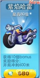 紫焰哈雷是新品摩托车,玩家能够得到10倍的bonus奖励得分,我们在开局时有600米无敌冲刺,紫焰哈雷售价680钻石,如果玩家是钻石购买,最高等级能够达到80级,是冲分必备的坐骑。