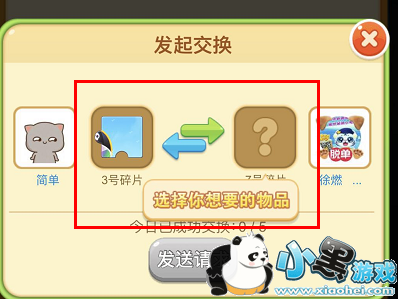 3.点击“交换”之后,我们就可以选择自己的碎片和想要的物品和好友进行交换,选择完毕之后,点击“发送请求”。好友同意之后,就可以收到碎片了。