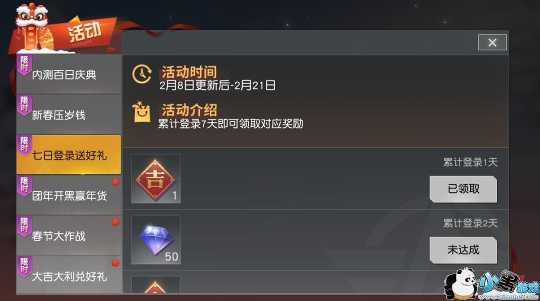 活动期间累计登陆 到达指定次数,可获得多重贺岁好礼 ,包括特定外观 和钻石奖励 等。