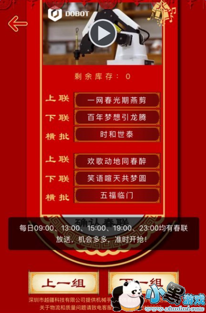每天9:00、13:00、15:00、19:00/23:00都会有实体春联可以抢哦,机会多多,准时开抢,朋友们千万不要错过了哦!