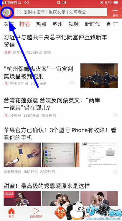 2.进入头条后,页面如下图,点击头像,我的是在左上角。ps:由于版本问题,有的用户的今日头条版本是在下方,点击“我的”。