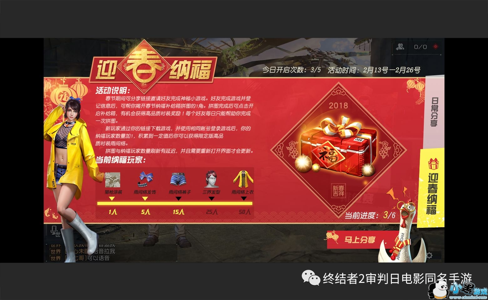 l 新增“迎春纳福”分享活动 ,玩家可以通过分享链接邀请好友完成神秘小游戏获得拼图碎片,集齐所有拼图可开启补给箱,有机会获得高品质时装,更可获得红包竞技场入场券。此外,邀请新玩家注册并登录游戏可积累纳福次数,纳福次数达到一定数量可以直接获得活动专属时装“雨间络”