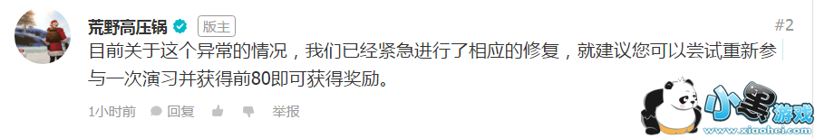 官方回答:目前关于这个异常的情况,我们已经紧急进行了相应的修复,就建议您可以尝试重新参与一次演习并获得前80即可获得奖励。